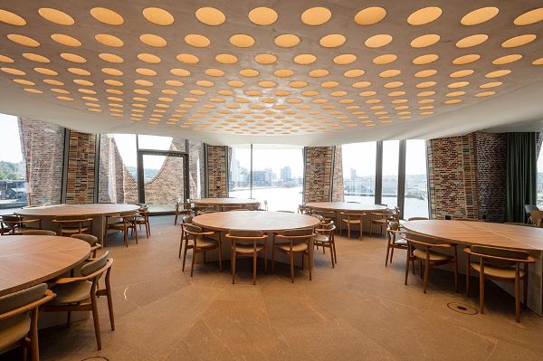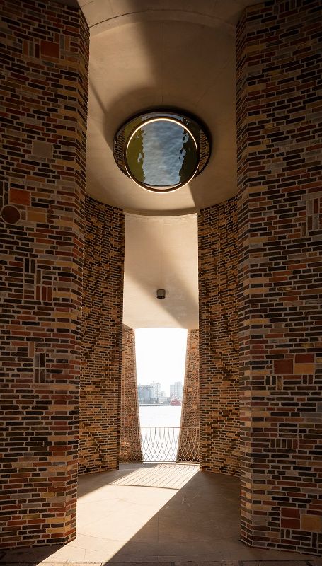 ?埃利亞松和他的團隊在該項目中設計了一個雙層通高的公共入口,這個入口服務于建筑同港口之間的關系,特別是在建筑插入水邊下方的那部分區域。從觀景平臺可以看到兩部分的水域。與周圍景觀的聯系在建筑空間和埃利亞松的藝術作品中都是非常重要的,這與不斷變化的環境形成對話。
