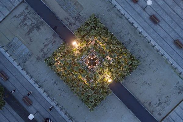 它位于游泳池中心,正如設計師所說,是一個“浮動花園”, 是為了邀請人們在城市中心郁郁蔥蔥的綠色避風港中放松身心而建造的。圓頂形的裝置讓人聯想到魔法、兒童世界和想象中的風景。
