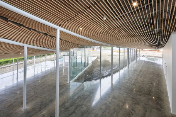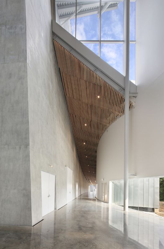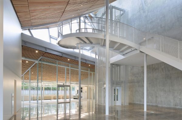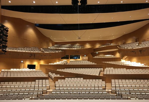 從外表上看,這座建筑被分成了幾個體量,越靠近場地周邊,體量越小。這樣設計不僅減少了綜合體的規(guī)模,也有利于與周邊環(huán)境保持聯系。在場地開發(fā)設計的過程中,妹島和世采用了“Sayadou”的風格,從歷史觀點上來說,這種風格包括在圣地或寺廟中建造一種保護性構筑物,用以躲避惡劣天氣的影響。場地的布局如同一座“葡萄園”,建筑的焦點放在了音樂廳上,觀眾席一層一層地包圍著舞臺。