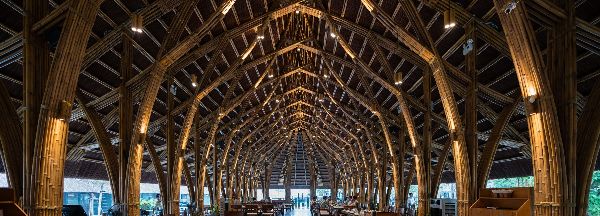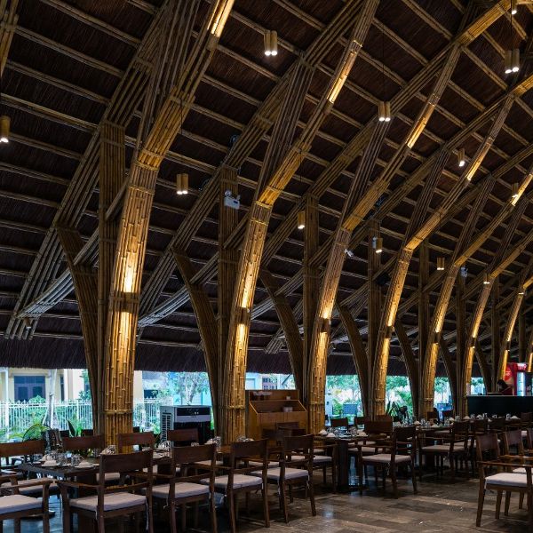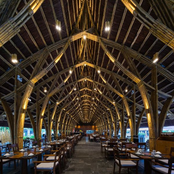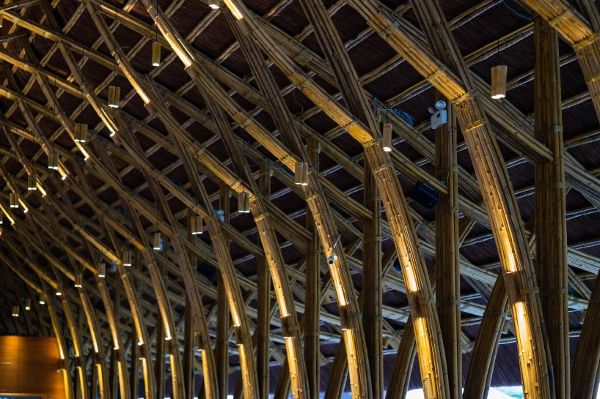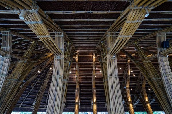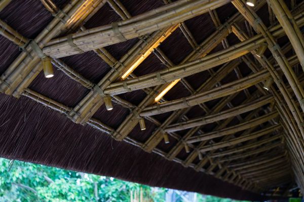 餐廳內部的空間結構節奏由不斷周而復始的竹框架結構來定義,在每間隔2米(6.5尺)的地方就有竹節螺栓和滌綸繩將框架再次綁扎連接在一起。由茅草覆蓋的屋頂可以保護竹子免受潮濕和蟲害的侵襲。餐廳的整個建筑結構清晰可見,可以說有著非常良好的可見性,這樣一來,就很容易發現竹子隨時可能損壞的跡象。