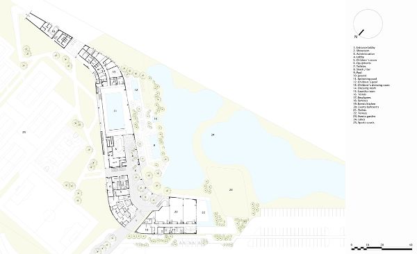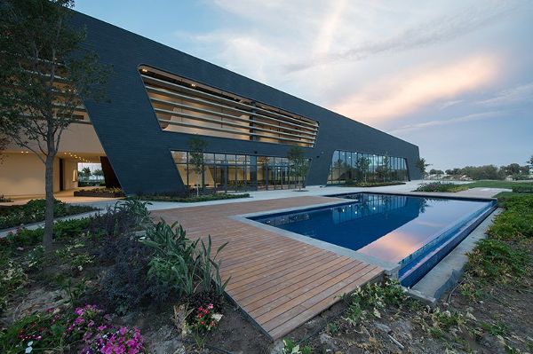 為了呼應周邊景色及當地氣候條件,Budic建筑公司設計的建筑形式能從外部有效地抵御當地的炎熱天氣。建筑內部的設計圍繞著一個兩層的大廳分布進行,它們由百葉窗和精心布局的樹所保護。建筑第一層有辦公區域,餐吧和泳池。樓上的更衣室可以通往垂壁式的露臺,在那里人們可以放松休息。