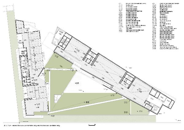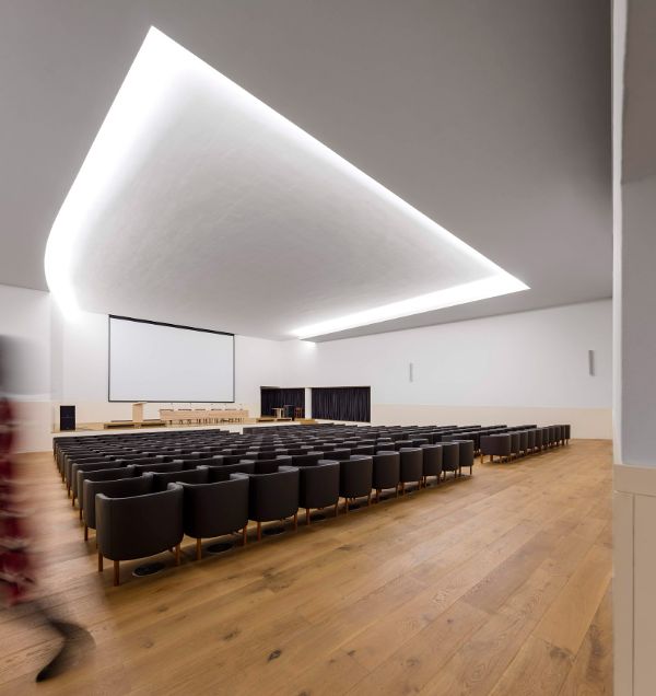 靈活性和流動性內部布局的配置使得訪客流線十分順暢。地下室包括技術和服務區、檔案館,以及一個通往建筑中心三角形庭院的咖啡廳。在上面,首層包括入口和休息區,以及臨時展覽廳和禮堂。夾層也可以訪問,而坡道通向室外屋頂花園。最后,頂層是關于包豪斯的收藏,還包含行政區域,以及青年藝術家的講習班。