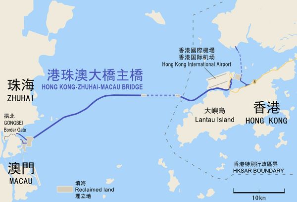 世界上最長的跨海大橋已正式開通,它連接了香港、澳門和珠海。港珠澳大橋全長55公里(34.2英里),按照雙向三車道建設。該項目是跨越中國南部56,500平方公里(21,800平方英里)更大海灣區域計劃的一部分,共包含11個城市。該項目是希望通過這座大橋直接連接三個沿海地區,并與舊金山灣共同形成一個有競爭力的技術中心。