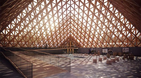 該項目由SPI集團的Stoli Group公布,該部門負責肯塔基州貓頭鷹波旁威士忌的管理、分銷和營銷。該建筑群將擁有一系列建筑,精心布置在自然景觀中,具有工業本土化的設計美學。坂茂對該項目的設想可以追溯到19世紀,當時的大跨度鋼結構已經被大量木材重新詮釋。