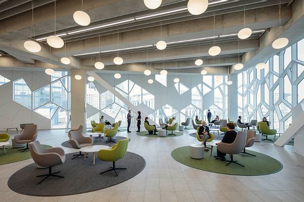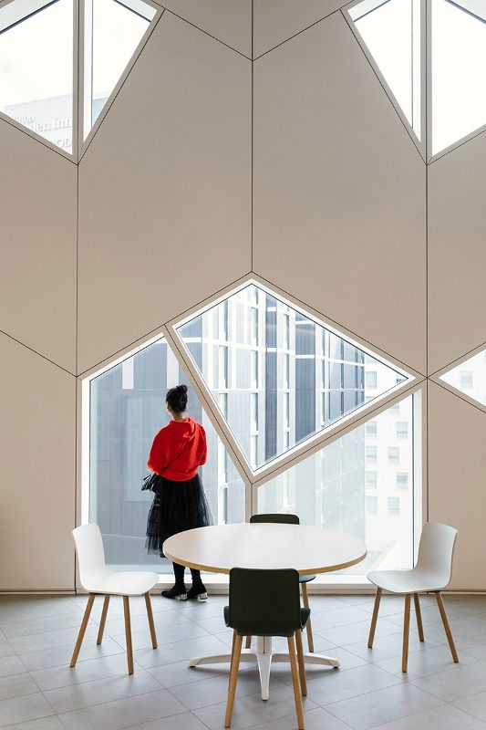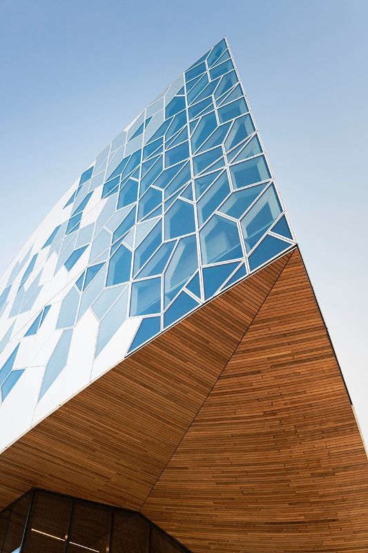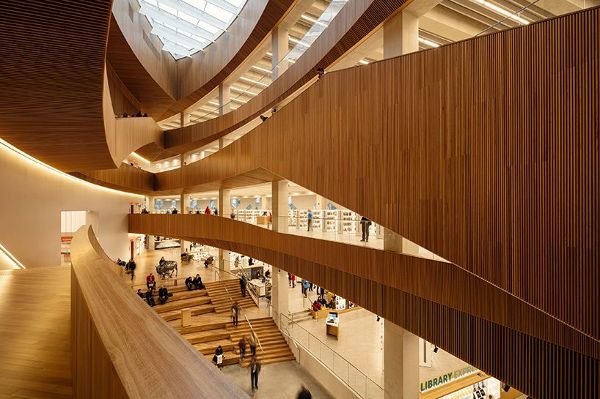 整個建筑包裹在一個動態的三層玻璃立面中,由模塊化的六角形圖案組成,其面板材料的變化包括燒結玻璃和偶爾的彩虹鋁。這種建筑詞匯在內部延續,體現在圖書館的新視覺標識和建筑中的尋路標志的設計中,統一了設計的包容性目標。寬闊的木材下腹部框架的主要入口,并擁抱游客,因為他們接近的形式,參考奇努克云拱門共同的地區。這種雙彎曲的外殼完全是用不列顛哥倫比亞省附近的西部紅雪松木板制成的,現在是世界上最大的自由形式的木材結構之一。