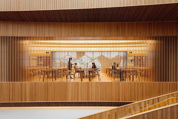 sn?hetta和dialog結合原木材料,未經過加工的混凝土,旨在讓人們意識到圖書館可以按照他們的愿望進行設計,而不是作為一個神圣的書籍庫。在街道層面,一系列多功能房間周邊的建筑,而活潑的公共活動位于較低樓層,逐漸過渡到安靜的研究領域上層次之前結束在“大閱覽室”,被設想為一個珠寶盒藏在圖書館。圖書館的最北端標志著另一個特殊的空間,“客廳”,可以俯瞰鐵路線和兩個社區的交匯點。