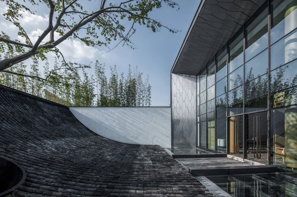 上海成執建筑設計完成了位于中國重慶的多功能“原麓社區中心"。項目毗鄰龍興古鎮,御臨河邊,有遠山起伏。作為對環境的回應,建筑師將三個體量不同的盒子并列于山坡上,沿著斜坡并排組織,形成連續的間隙庭院。建筑師依據功能將每一個建筑空間依序形成不同的體量,設有展覽廳、書吧、游泳池、餐廳等功能。