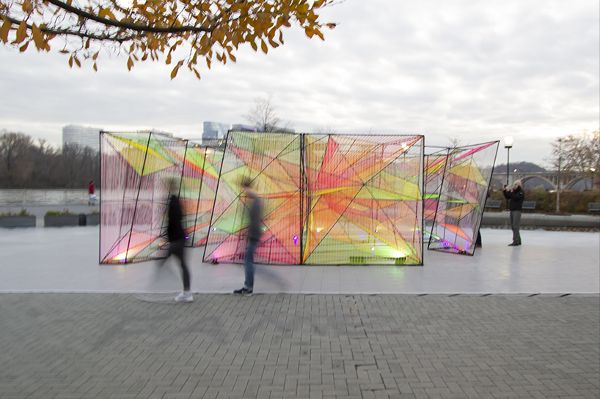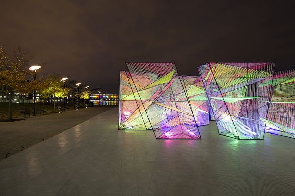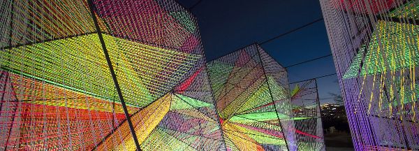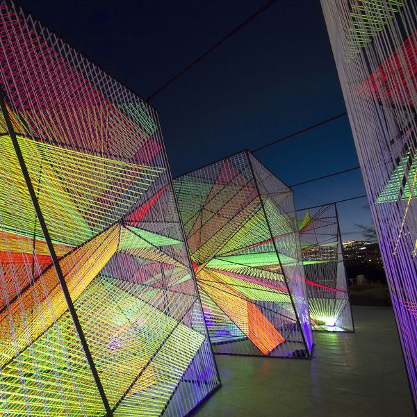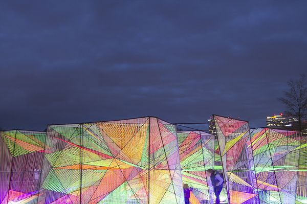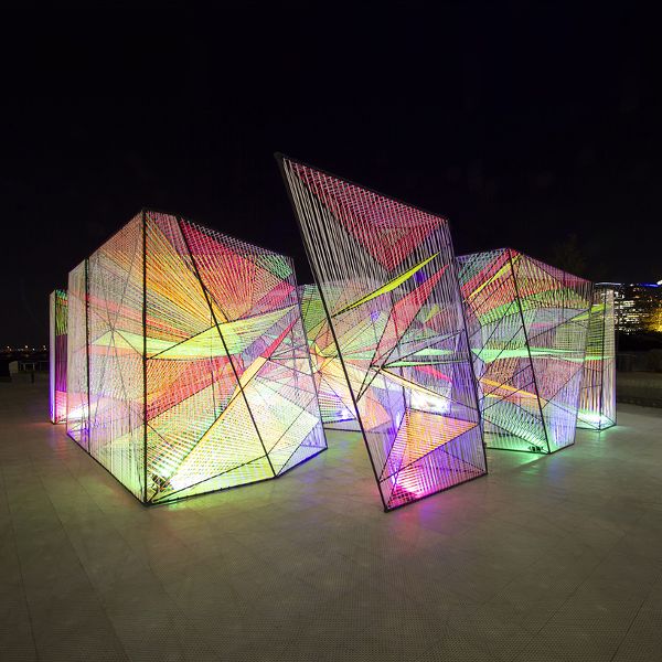 由紐約工作室hou de sousa設計的“棱鏡”是一種光、色和空間的萬花筒體驗,它構成了無數的視角。這件作品在各個方面都是獨一無二的,鼓勵公眾去探索它的外觀,以及在半透明的“街道”中漫步。 雕塑部分由連接到輕質鋼格子的熒光線組成。繩索之間的開口產生稱為莫爾條紋的視覺效果,其中由重復細節的疊加產生波浪圖案。