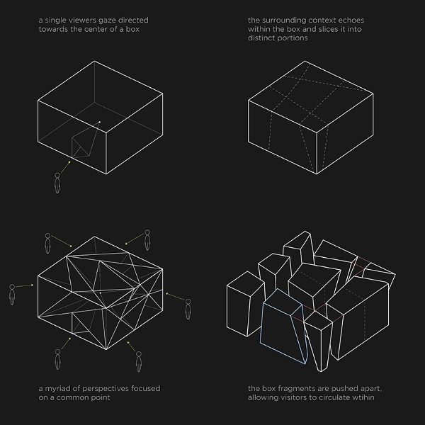 設計過程發生在三個階段:首先,一盒是由棱鏡細胞狀的從中心點輻射,像噴泉一樣的輪廓,然后分裂和傳播盒子分開。其結果是形成一系列不同的孔徑和角度,集中在一個中心核心。