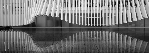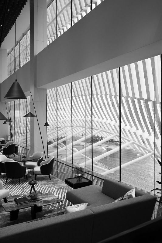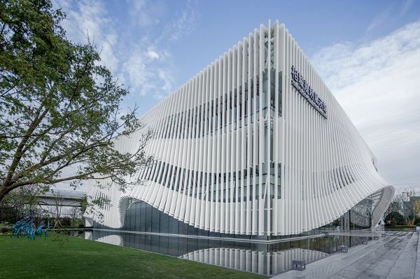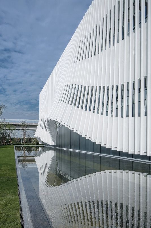 新展廳的立面對日清建筑事務所的整體設計至關重要,最顯著的特點是立面優雅和動態的效果,它看起來像一個“上升的窗簾”。建筑外觀的形態實際上是受到一種叫做“馬林巴琴”的樂器的啟發。為了產生這種效果,立面的外幕墻由可以形成這種形式的垂直構件組成。