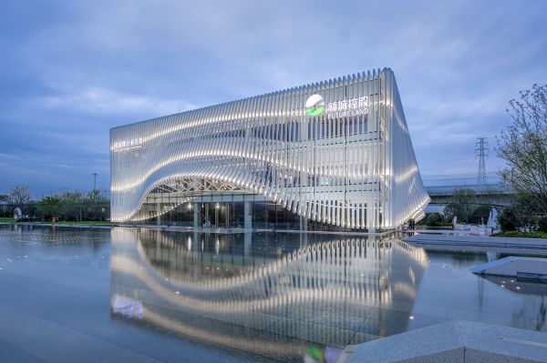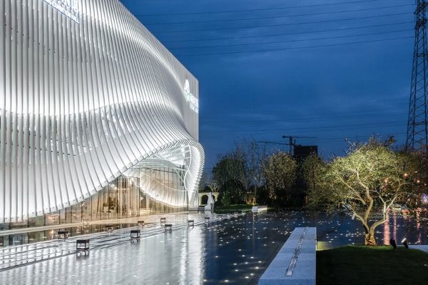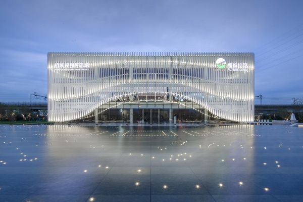建筑物的高度對總體設計尤其重要,因為它的設計高度定在與高鐵上的人視線齊平。至于景觀,建筑師結合了水池,一呼應建筑和優雅的弧形立面輪廓。日清建筑事務所的理念是設計一座成為新地標和視覺焦點的建筑,并通過優雅的外觀、新的展覽館實現了這一目標。
