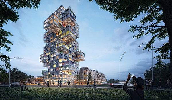 在原有建筑的旁邊,MVRDV設計了一個新的建筑,是一個具有折線形裙樓的建筑,裙樓包含辦公和購物;裙樓上方的幾個立方形體塊將承擔住宅功能,塔樓則將作為辦公空間。場地的一端,包含250間客房的酒店大樓通過公共活動空間與上述裙樓相連,這個公共活動空間今后將用于舉辦社區組織的展覽和活動。