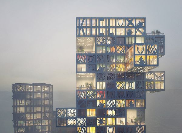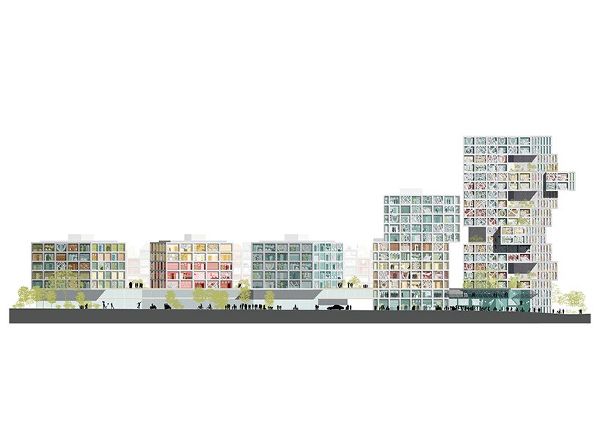 活潑的外部空間是該項目的關鍵:建筑之間的庭院充滿了各種可供居民使用的公共設施,蜿蜒的屋頂花園分布在三個立方體住宅體塊之間。由纖維增強混凝土制成的立面面板是該項目最引人注目的元素,它被置于窗前,展示著各種圖標,靈感來自當地人的創意。設計不再是一個固定的概念,而成為一個靈活的系統。最終建成的建筑可能會落在提供的一系列選擇中,從保守的盒子到古怪但充滿魅力的懸臂和圖像集合。
