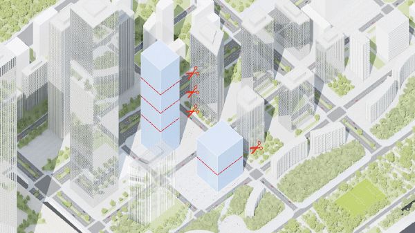 MVRDV在萬科組織的深圳新總部設(shè)計競賽中獲勝。這座250米(820英尺)高的大樓——暫時地被稱為“萬科3D城市”——由八個相互連接的空間體塊組成,分別作為辦公空間,住宅空間和文化空間。MVRDV將建筑用地劃分為四個獨立的建筑地塊,隨后漸漸上升并聚攏為一個單一體塊的高塔。該方案遵循“三維城市”的概念,這是MVRDV進行的一系列研究項目的成果。