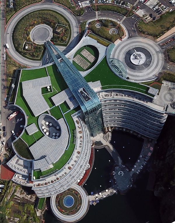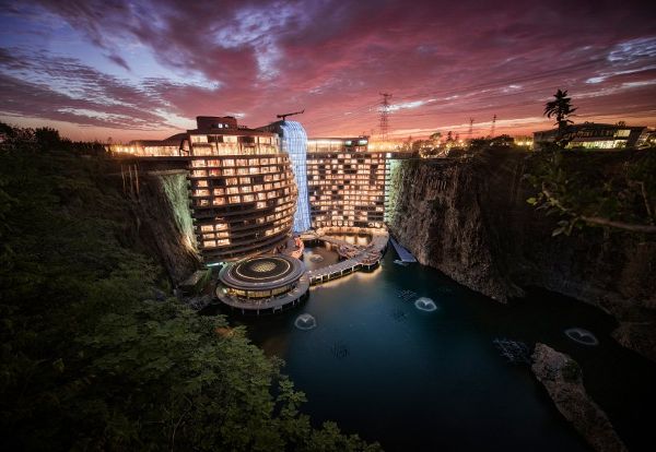 這家位于中國的酒店坐落在一個88米深的廢棄采石場于2012年首次亮相,并于2018年11月投入使用。該項目被設想為一個“地面疤痕”,只比地面高出兩層。另外16層沿著崎嶇的采石場懸崖面向下延伸,另外兩層位于采石場底部的水下。這些“水下”空間包括客房和公共區域,如餐廳和水下水族館。
