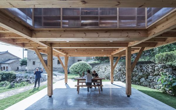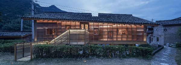 樹林建筑設計的書屋被群山和茂密的森林所包圍,坐落在離村莊廣場不遠的地方,旁邊是保存完好的夯土四合院。十根柱子支撐著整個木結構和鋼結構,在地面上創造了一個半室外庭院,水面反映了自然、時間和空間。首席建筑師 劉東英說:“天井空間的設置,就是在等某個特定的時間——陽光灑進來,形成一道光影;雨水落入水院,產生一點漣漪;空氣流進來,感受一縷微風。”在這樣的時刻,天井被設定為一個等待此時間點的特殊意義空間。我所理解的鄉村建筑的精髓,是一種人與空間、人與自然、人與時間和諧共處的狀態。