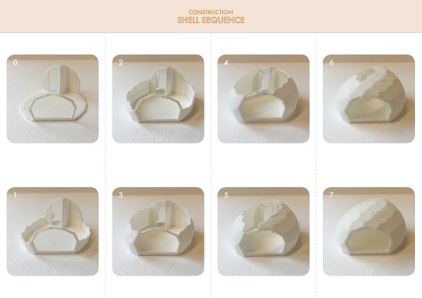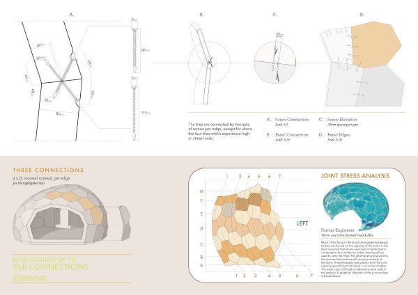 該網(wǎng)站利用無人機和攝影測量軟件進行了3D地圖的繪制,提供了一副詳細的地表地圖,然后將其用作尋找形狀的基線。其結(jié)果是一個木制的交叉層壓的木材殼與77個獨特的面板配合在一起,看起來就像一個3D拼圖。該設(shè)計隨后在模擬的風力條件下進行了測試,以確保它能夠經(jīng)受住冬季北極風暴和極端的風力條件,并同時保持無雪狀態(tài)。3D打印被廣泛應(yīng)用于測試結(jié)構(gòu)如何組合在一起,以及測試室外表皮材料的選擇。