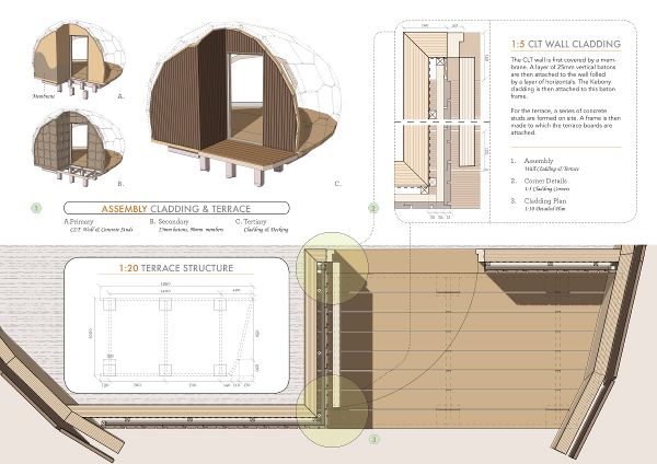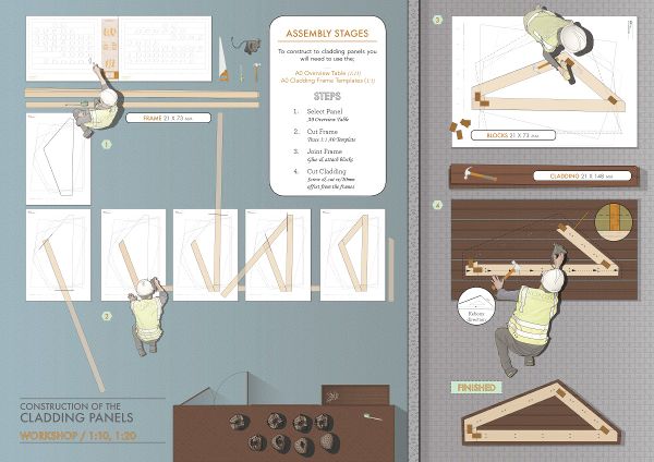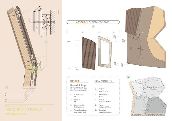 最后,他們決定在一個受控的倉庫環(huán)境中構(gòu)建這個結(jié)構(gòu),將其組裝在一起并進行測試,然后部分拆卸用于運輸。一組志愿者在4個工作日的時間內(nèi)完成了預制CLT板的主體結(jié)構(gòu)安裝,另一組志愿者根據(jù)SPINN的?1:1的圖紙完成了框架和外包層面板的切割和測量。