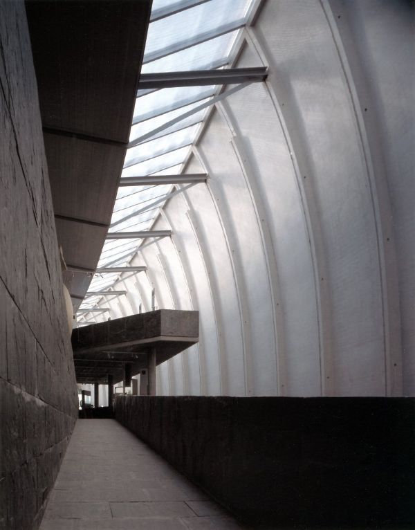 北九州中央圖書館的設計靈感來自于法國國家圖書館(1785年)艾蒂安-路易·布利的設計方案。izosaki通過預制混凝土實現了對新古典主義拱形天花板的現代詮釋。建筑的兩個大桶形拱頂在分開彎曲之前平行運行,與外部的矩形窗戶形成對比。