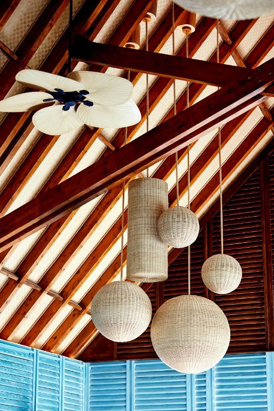 該項(xiàng)目最引人注目的結(jié)構(gòu)之一是到達(dá)碼頭,其特點(diǎn)是一個(gè)雕塑般的波浪般的天篷,為到達(dá)度假村的人提供庇護(hù)。整個(gè)建筑頂部是茅草屋頂——這一姿態(tài)已經(jīng)延伸到度假村的其他部分。在內(nèi)部,不同表面使用的調(diào)色板參考了椰子的不同色調(diào),這是島上最獨(dú)特的特色之一。
