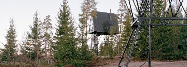 建筑師espen surnevik在挪威東部設(shè)計了一對高架小屋,靠近瑞典邊境。位于芬蘭斯科根,一個廣闊的森林地區(qū),這兩個住宅的設(shè)計基于相同的圖紙,但他們都是被特殊定制以適應(yīng)兩個特定的位置。客房通過螺旋樓梯塔進(jìn)入,可以將客人帶到離地面6米的地方。他們被包裹在黑色氧化鋅和鋼里,雙外殼每個尺寸40平方米(430平方英尺)。