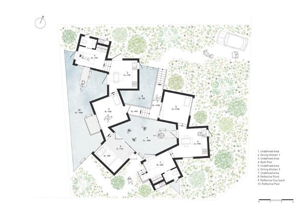 與傳統的平面圖不同,這個方案不同高度和角度的部分相互連接——結合不同的樓層——被設計成讓居住者感覺他們是在原始地形上行走。“當你在建筑內外漫步時,燈光圍繞著天窗,并通過水面擴散的少量開口流入室內,”鐘永漢繼續說道?!八鼈冏罱K滲入內部,模糊了陸地和水的邊界。