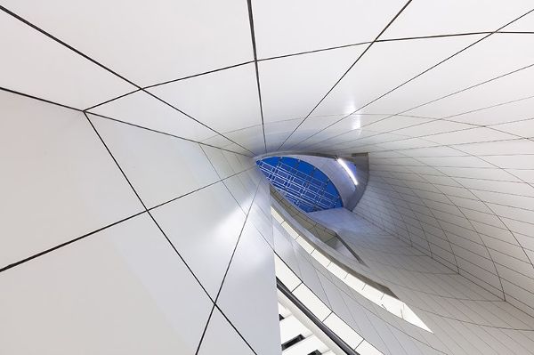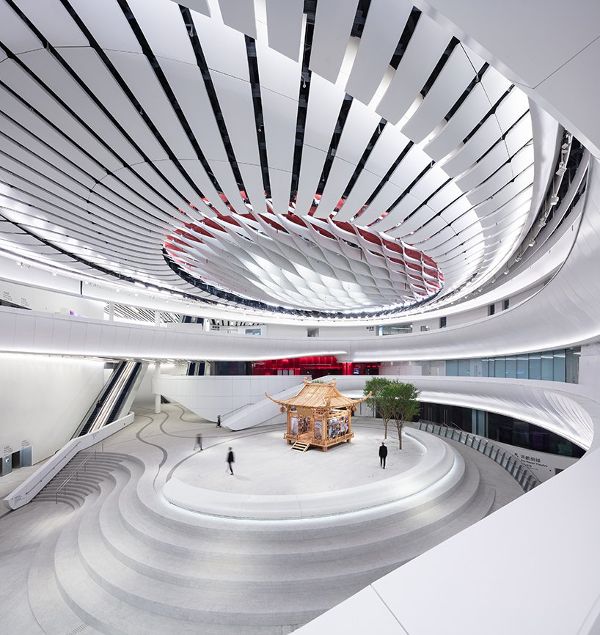 弧形立面采用模塊化系統(tǒng),由未經(jīng)處理的船用鋁管切割而成的鱗片狀鰭狀結(jié)構(gòu),既美觀又增強(qiáng)了性能。這些彎曲的翅片在建筑中交替排列,散發(fā)出迷人的光芒,讓人想起燈籠。立面外殼的編織金屬板在所有四個(gè)角落輕輕拉開入口,輻射光的外觀而暴露的內(nèi)部庭院。立面向迷人的圓形中庭開放,這個(gè)壯觀的自然通風(fēng)的庭院廣場邀請公眾欣賞展覽、瀏覽商店、聽音樂或觀看戲曲展示,使這種最傳統(tǒng)的中國藝術(shù)形式能夠被新觀眾和未來的一代所接受。