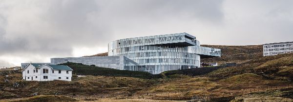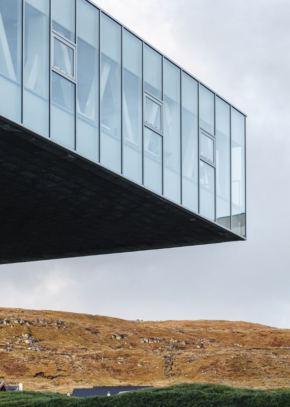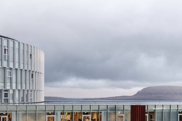 “glasir”的室內材料調色板的特點是使用石頭、澆注混凝土和木材,產生自然和柔和的美感。外部,建筑采用玻璃和鋁材料,突出了圓形的雕塑形式,在風景優美的法羅背景下創造了大膽的形象。從外面看,外部的玻璃幕墻安裝在鋸齒狀的瓦上,使直線的元素形成一個柔和的圓形,融入自然環境。此外,屋頂上還種植了草,草會慢慢生長,讓“glasir”最終融入到周圍的景觀中。