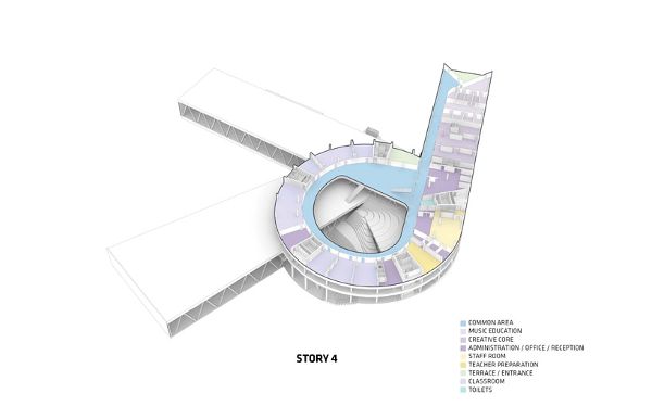 由于建筑功能的不同,“glasir”的整體形式由BIG設計,以傳達這些不同的需求和身份。體系結構表達式背后的概念被認為是由五個層次組成的堆疊。這些層次圍繞著一個中心庭院,喚起了漩渦的形象,其功能輻射表現為一個中心的社會空間。這五個級別包括三個機構各設一個,另兩個一個負責食物和教職員工,一個負責體育鍛煉和聚會。