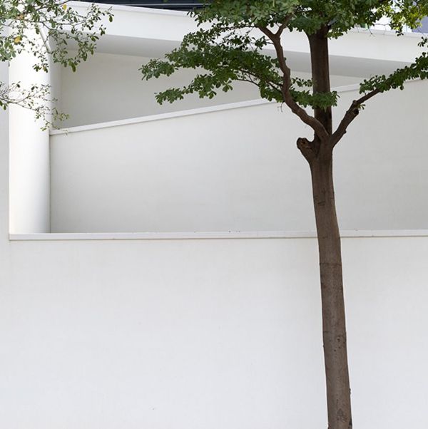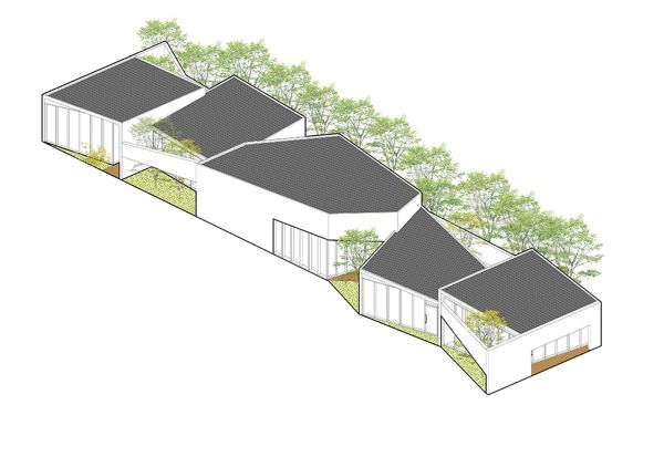 mozhao建筑事務所從傳統建筑元素——傾斜屋頂和庭院空間——中吸取靈感,為“生活藝術館”設計了屋頂結構和混凝土肋梁,增強了傾斜屋頂的內部透視效果。隨著墻高和斜梁的變化,院子里的樹木顯得模糊不清。同時,裸露的混凝土梁保留了松木模板的木材紋理。簡單的白色墻壁和灰色的混凝土磚與自然環境很好地融合在一起,而且每個單元的庭院空間正南正北朝向布置。