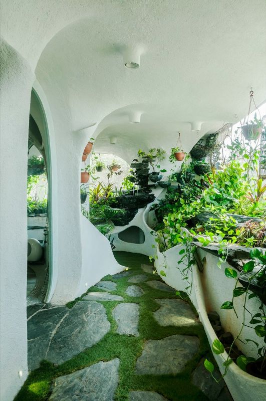 總部位于孟買的白色房間工作室,設計了雕塑感很強的“花園房間”。“工作室以表達材料的天然性而聞名,創造出流暢、有機的幾何形體。住宅的特點是柔和的曲線和粗糙的材質,未經處理的表面充滿了自然光。花園房間由一個單獨的臥室組成,它占據了一個田園花園。外墻由彎曲的孔洞雕刻而成,表達了自然地貌或被樹葉穿透的洞穴的性質。