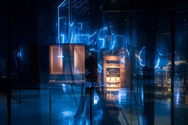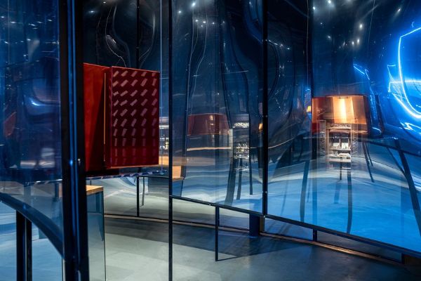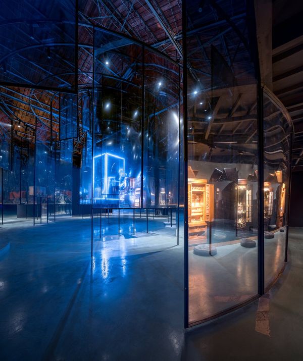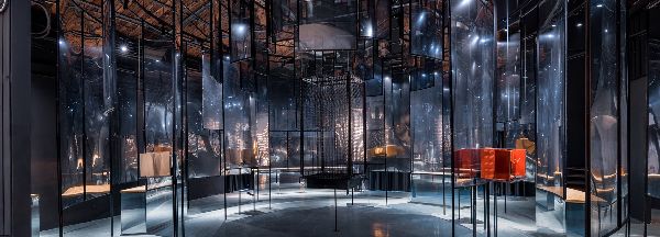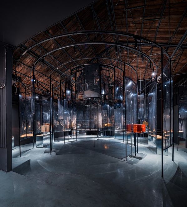 由棟棲設計建筑事務所設計的車間位于一個以前的工業建筑內,其設計理念圍繞著一個圓圈。許多同心圓在玻璃和鏡面材料中形成,創造了迷宮的概念,表面優雅地展示了佛教圣地和紀念品。隨著曲線從中心點展開,空間提供了一種有趣的元素,邀請游客在迷宮中漫步,探索展品。在這些環的中間坐落著引人注目的“空間”裝置——一個作為空間高潮的虛擬神龕。