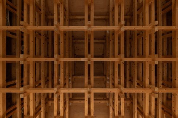通過(guò)厚重的格子框架中層層疊疊的木材,森田和也設(shè)計(jì)事務(wù)所為圖書(shū)館創(chuàng)造了強(qiáng)烈的視覺(jué)識(shí)別。每一塊9厘米的柏木方木片的長(zhǎng)度只有3到4米,為了避免材料的橫截面損失,建筑師選擇使用長(zhǎng)螺絲將它們固定在一起,而不是使用傳統(tǒng)的搭接方法。與木格框架形成對(duì)比的是,建筑的混凝土基礎(chǔ)為整個(gè)結(jié)構(gòu)提供了支撐,同時(shí)作為蓄熱體,穩(wěn)定室內(nèi)環(huán)境溫度,并將能耗降至最低。