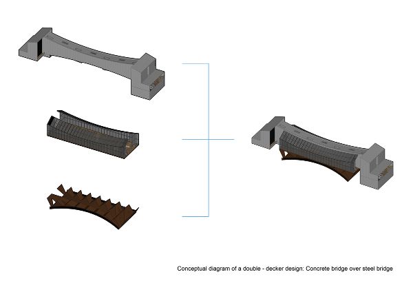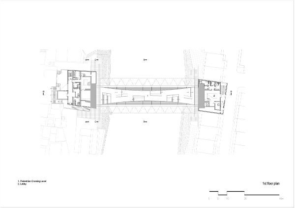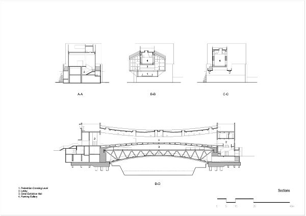 橋下一層采用開放式鋼桁架結(jié)構(gòu),模仿有屋頂?shù)慕值溃┬腥送ㄐ校蠈幼呃葎t采用現(xiàn)澆混凝土拱。博物館覆蓋了全高的玻璃,這使得明亮的室內(nèi)能夠反射下面的水,同時瓷磚遮陽系統(tǒng)覆蓋了畫廊的主廳,用于臨時展覽。在博物館兩端的兩個橋頭堡內(nèi),有入口大廳、行政辦公室、商店和茶室等休息空間。行人和游客可以從河的兩端進(jìn)入博物館。