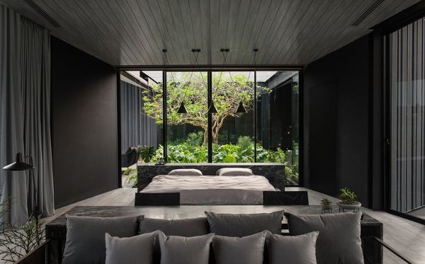 主臥室向消失點打開了一個大膽的吸引力錯覺。這種錯覺是由逐漸變細的墻壁和傾斜的天花板形成的,天花板通向床頭板后面的庭院。臥室的入口是一個較大的前廳,天花板較高,適合作為起居空間,而臥室內較遠的區域天花板較低,較窄,為睡眠提供了合適的氛圍。