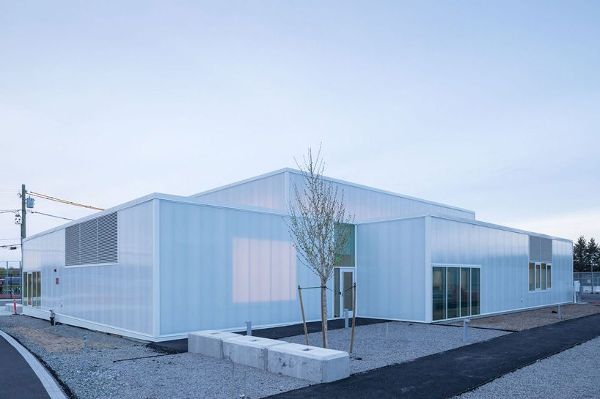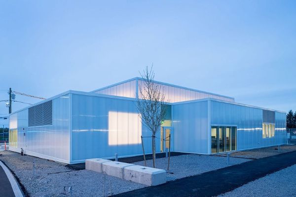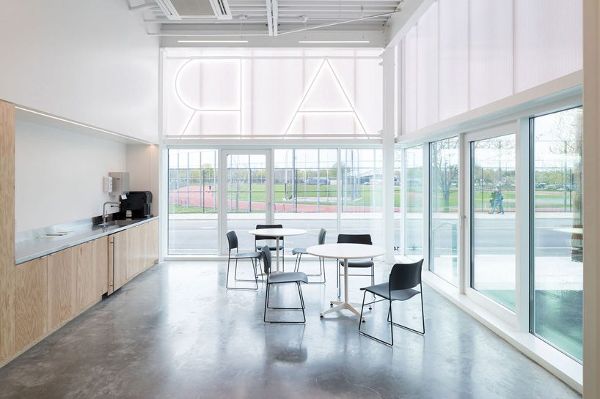 建筑外覆透明隔熱玻璃和輕質高絕緣聚碳酸酯板,符合馬薩諸塞州的高能源效率標準,預計凈零能耗,它由輕質鋼柱和混凝土板上的鋼桁架按等級建造。框架是機械緊固的,能夠輕松有效地組裝和拆卸,允許建筑實現結構轉移,并在需要時賦予其第二次生命。這些材料從透明到半透明,再到不透明,聚碳酸酯面板在白天將自然光擴散到建筑中,而整個結構在晚上就像一個發光的“燈箱”。這些材料強調了建筑的短暫性,同時為藝術提供了一個健耐用和可適應的空間。建筑的屋頂覆蓋著光伏板,產生建筑所需的電力。