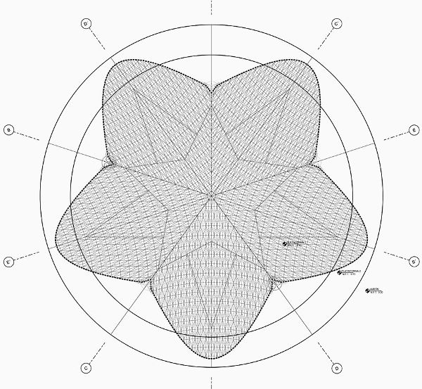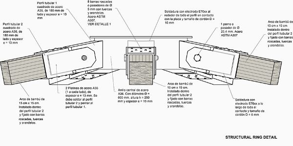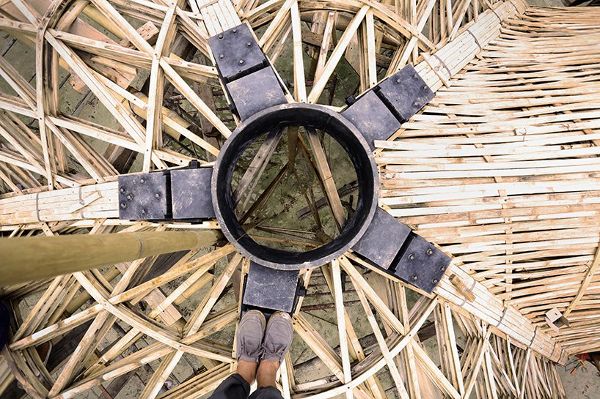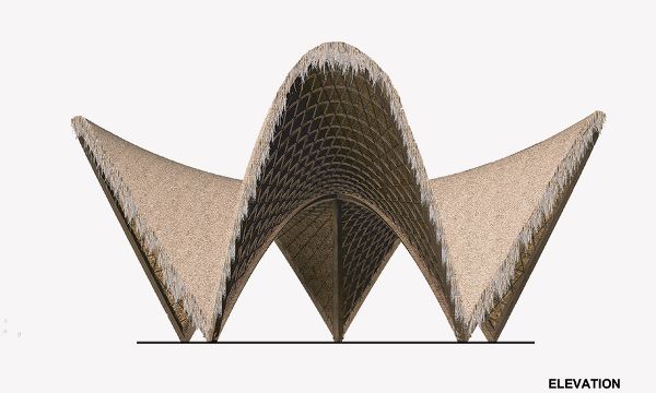CO-LAB使用參數(shù)化軟件設(shè)計(jì)了LUUM太陽形狀的洞穴,形成了一系列相互支持的拱形拱頂,具有象征性信息的美學(xué)選擇。 這些共存的拱頂可以提醒社區(qū)我們的相互依賴性,特別是我們?cè)谝黄鸸ぷ鲿r(shí)可以取得的成就。 竹子在鄰近的恰帕斯地區(qū)可持續(xù)養(yǎng)殖,在現(xiàn)場(chǎng)彎曲,擰緊并捆扎在一起,使每個(gè)單獨(dú)的編織件一起作為一個(gè)統(tǒng)一的元素。 一旦拱門被抬起,它們就被一個(gè)結(jié)構(gòu)的三角形圖案編織在一起,并進(jìn)一步由兩層連續(xù)的緊密編織的竹格子層組成。 在外部,一層當(dāng)?shù)氐臈棙洌ú菝┎菸蓓敚┍Wo(hù)結(jié)構(gòu)免受雨水的侵襲,并使其能夠在圖盧姆的熱帶氣候中呼吸。