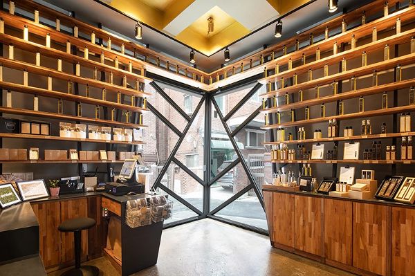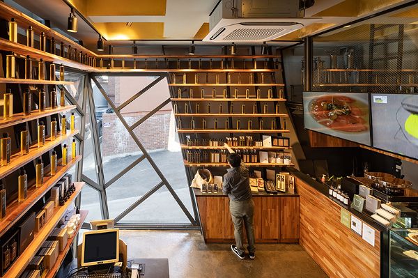 高天花板的一樓是該公司的旗艦店,而夾層則是一個陳列室。文勛解釋說:“這家微旗艦店展示了許多金色芝麻產品,這些產品像韓國一些佛教寺廟里的金色小佛像一樣垂直擺放。”接下來的兩層是生產芝麻油的工廠,而第四層是一個大視角的窗戶,那里有一個面包房廚房。