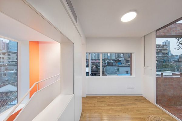 URBANUS通過重新組織每個22平方米的生活空間,創(chuàng)造出相互連接的房間,并確保它們都能通過一系列有策略性的窗戶和頂層額外的天窗獲得充足的自然光和通風。客廳和廚房被安置在一樓,大部分家具都是內(nèi)置的,以節(jié)省空間,創(chuàng)造更多的可能性。為了加強整體結構,并簡化垂直循環(huán),工作室用一個舒適的雙人樓梯取代了原來的單級陡峭樓梯。頂層新建的透明房間和露臺提供了城市全景視角,以及靈活的活動空間。