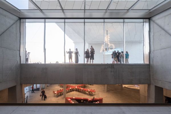 在一樓的其他地方,有票的人可以在OARA的250個座位的劇院欣賞演出,而在樓上,電影觀眾可以在ALCA的80個座位的紅色影院觀看放映,或者參觀兩個制作辦公室和項目孵化區。最后,FRAC占據了上層空間,寬敞的比例畫廊,藝術家的工作室,存儲設施,一個90個座位的禮堂,和一個咖啡館。一個公共屋頂平臺作為展覽空間的延伸,可以容納大型藝術裝置,在戶外有進行表演的空間,這樣成為了城市中美麗背景。