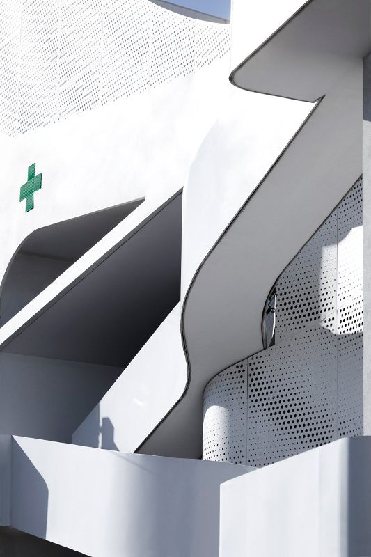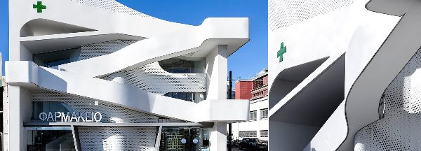 klab建筑事務所在藥房頂部設計了一個巨大的三角形穿孔結(jié)構(gòu),如同希臘最大的港口piraeus一樣,連接大陸和島嶼。該項目位于一個舊倉庫兼夜總會的舊址上,對原有建筑進行了徹底的改造,用新的混凝土結(jié)構(gòu)加固了原有的石墻,并建立了新的立面。