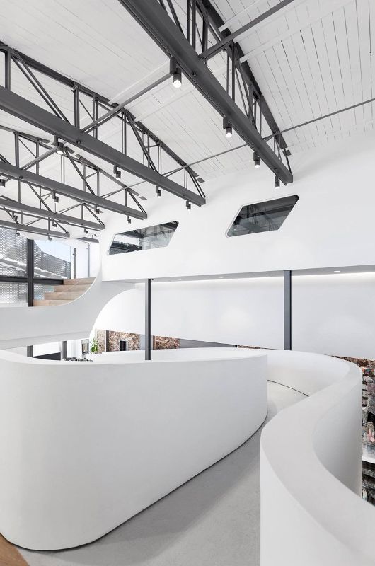 klab建筑事務所的摩爾藥房是美國最大的藥房之一,其外觀和內(nèi)部外觀都體現(xiàn)了大海的概念語言。在內(nèi)部,一系列的夾層以不同的方式相互連接,劃分了前倉庫的大而開放的體量,而彎曲的坡道創(chuàng)造了一條動態(tài)的流線,連接了商店的兩層。一間會議室和辦公室,以及一個用于聚會、瑜伽課、研討會甚至戲劇表演的獨特的多功能空間,位于上層,而一樓預留了零售區(qū)和一個小實驗室。