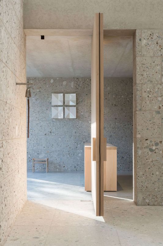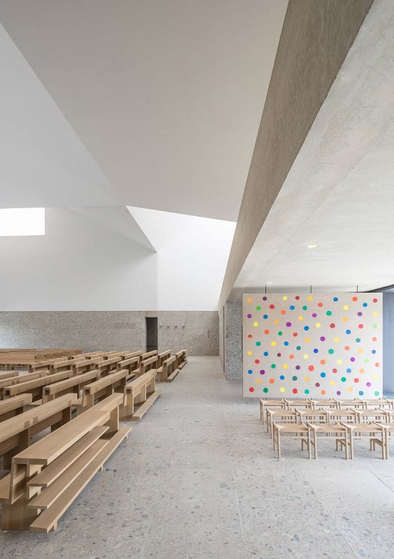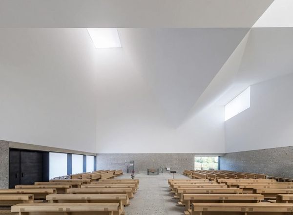 meck architekten的設計連接了新的北部和舊的南部地區,形成了一個向西北方向延伸的大型綠色走廊。教堂不規則的屋頂景觀成為poing社區的水晶皇冠,屋頂上有一個鍍金的十字架和一只向東看的公雞。在室內,通過不同的天窗和三個大開口,空間充滿了光,創造了一個類似于神圣的三位一體。墻面的特殊處理,加上漫射散亂的自然光,營造出一種超然的氛圍。