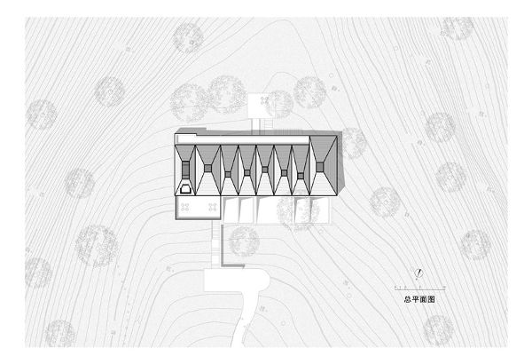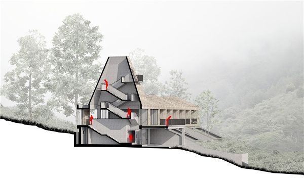一樓包括每個房間的室內花園,與景觀相關。花園由傾斜的墻壁隔開,墻壁的遠端深入地面,與茶園融為一體。二樓位于周圍的松樹中間,高度足以將它們圍起來,并成為它們樹冠的一部分。