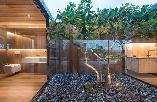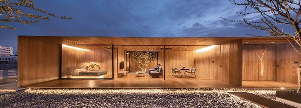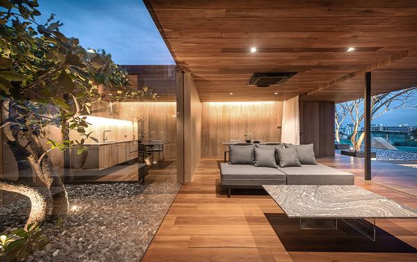 前段由三個網格組成,用作餐廳、客廳和臥室,業主可以通過一扇大的滑動玻璃門欣賞全景。其余三個網格則包括浴室、一個可以從房子任何地方看到的庭院和一個廚房。由于業主有大量的Balau木板,因此它們被用作包層材料,最終的效果是一個用木材的暖色調搭配天空的冷色調完成的空間。