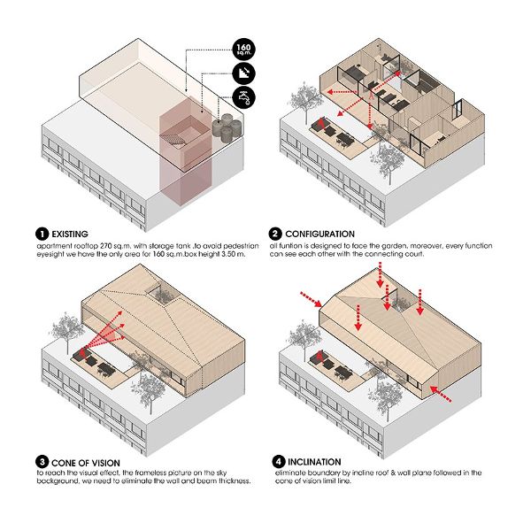為了消解小房子和下面公寓之間的界限,該團隊設計的建筑并不能在公共道路被發現,這個想法并不是要讓公寓感覺像一座建筑,而是讓它像一個無邊界的盒子,從天而降。其目的是給旁觀者制造一種錯覺,即整個天花板都在同一直線上,它的特點是一個斜坡,特意用來使墻壁和天花板顯得很薄。
