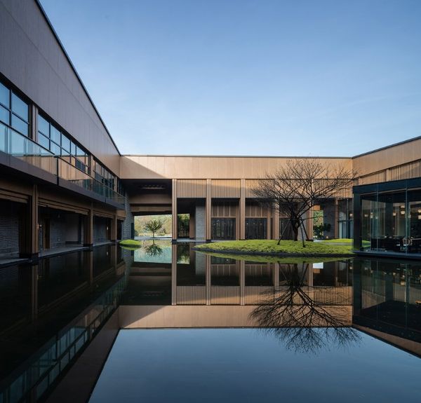 庭院內外的設計都運用了水元素,各類建筑元素在水中倒影,人們可以從外面體驗禪宗花園的生活,從內部欣賞山脈的不同風景和氣候。該建筑采用兩種顏色裝飾,灰色的外墻和木制的內部裝飾。掛毯磚以空心磚墻的形式拼貼而成,上面覆蓋著小塊灰綠色的屋頂瓦片,營造出一種謙遜平靜的氛圍,與鄉村的背景相映成趣。