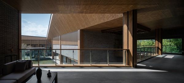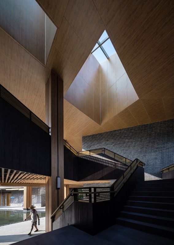 內院的材料采用大量的木質鋁板和玻璃,在陽光下展現溫暖。內外材料在檐口下過渡,吊頂的木色向外延伸,在水中反射,走廊和庭院周圍使用灰磚。天井采用進口印茄木,營造“四水歸堂”的安徽民居傳統景觀。建筑過程成為過去與現代的對話。