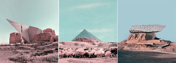 對于“復古未來主義”,Forouzanfar選擇了伊朗的一些地方,包括Fars、 Sistan、 Baluchistan、Khuzestan、Kashan等省的前伊斯蘭皇宮和城堡。西方現代建筑的插入提供了一種相互矛盾的組合,將伊朗的過去與西方的未來和現在聯系在一起。