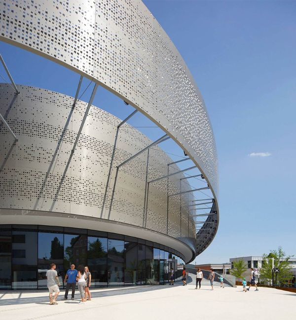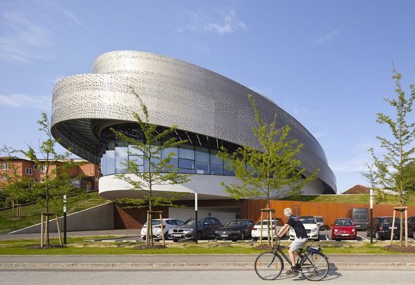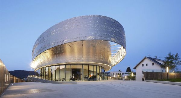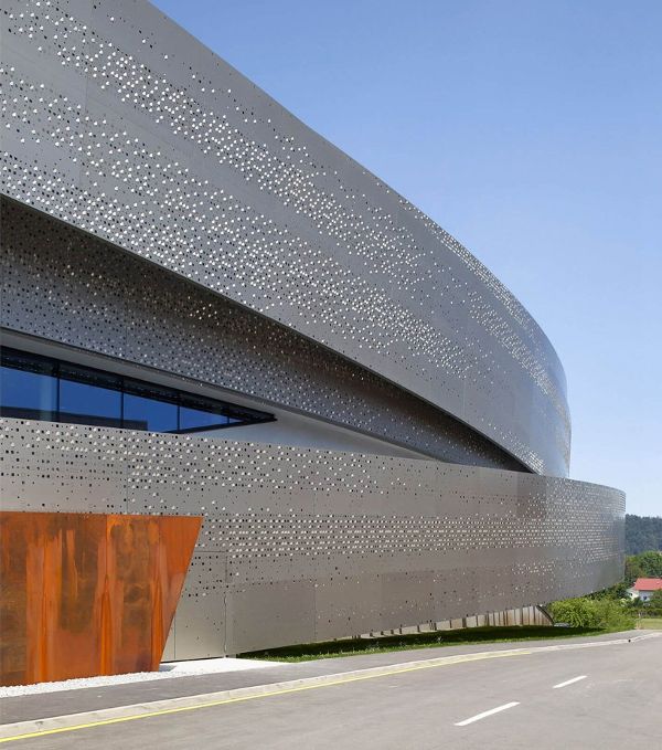 立面的掃掠軌道圍繞著建筑彎曲,被多孔的金屬帶包裹著,在周圍的直角建筑中脫穎而出,代表著品牌內外的活力。有機的結構結合了賽道的曲率,越野地形的條件和在其上行駛的KTM自行車,在令人驚嘆的建筑特色中總結了品牌的精髓。穿孔的圖案象征著輪胎印痕,就像騎手迅速騎過它一樣。